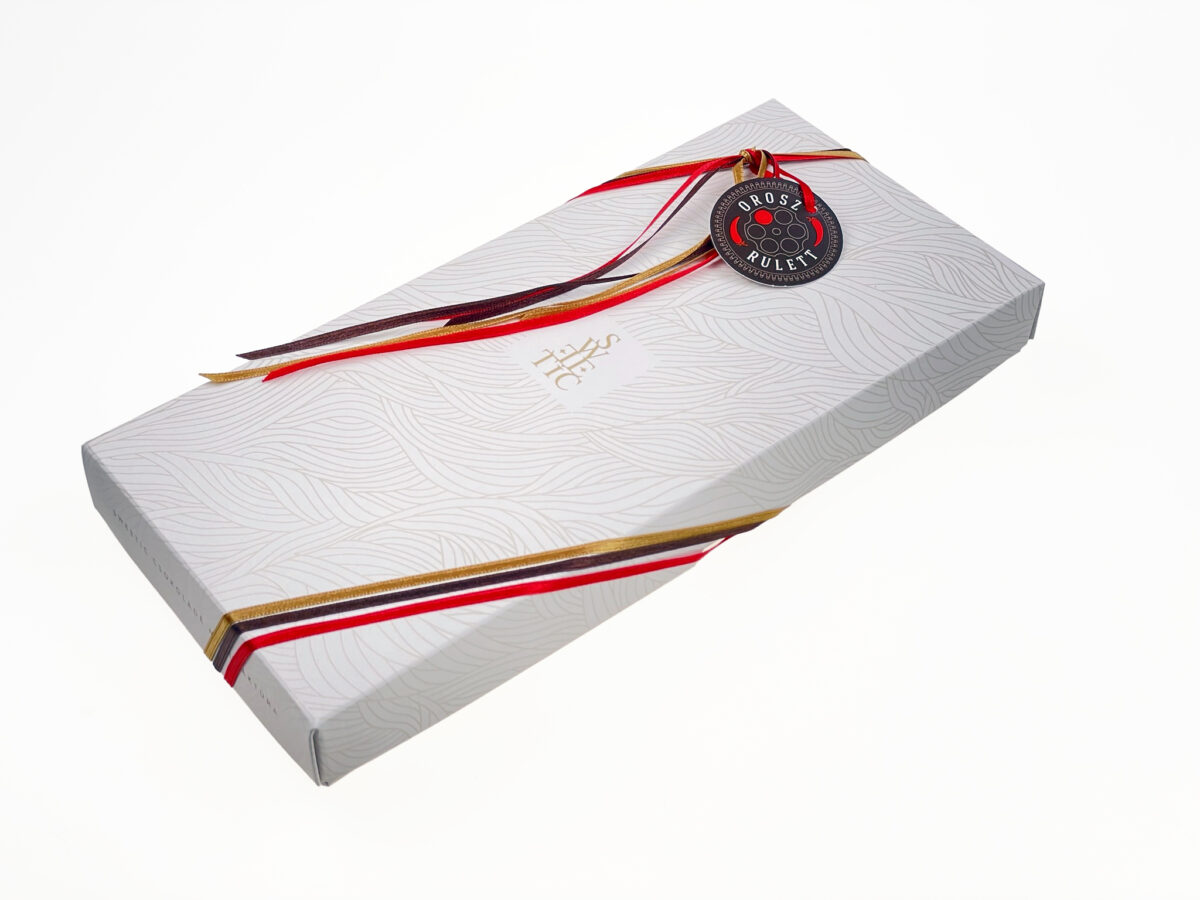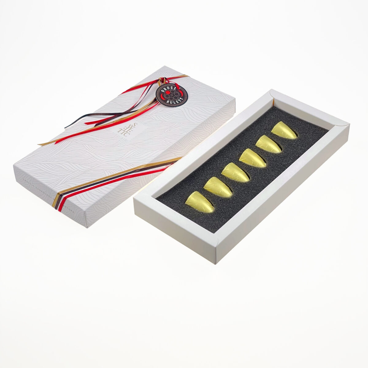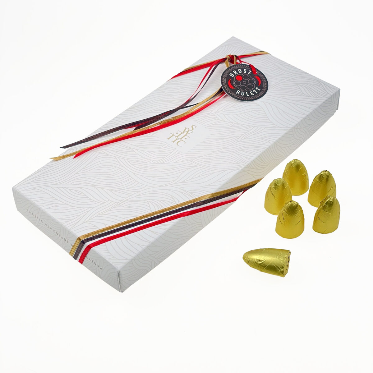 6 lövedék egy elegáns dobozban. Mindegyik aranyszínű fólia bársonyos gianduja krémmel töltött étcsokoládés bonbont rejt, de az egyik valakit majd csúnyán leterít. Ugyanis a 6 közül egybe nagyvonalúan adagoltunk a világ legcsípősebb chilijei közül kettőt: ezek közül az egyik az égető érzésért, a másik a könnyezésért felel! Vigyen életet a buliba az orosz rulettnek ezzel a nem végzetes, de mégis markáns változatával. Garantáljuk, hogy mindenkinek potyogni fognak a könnyei. Egynek a chilitől, ötnek a nevetéstől!